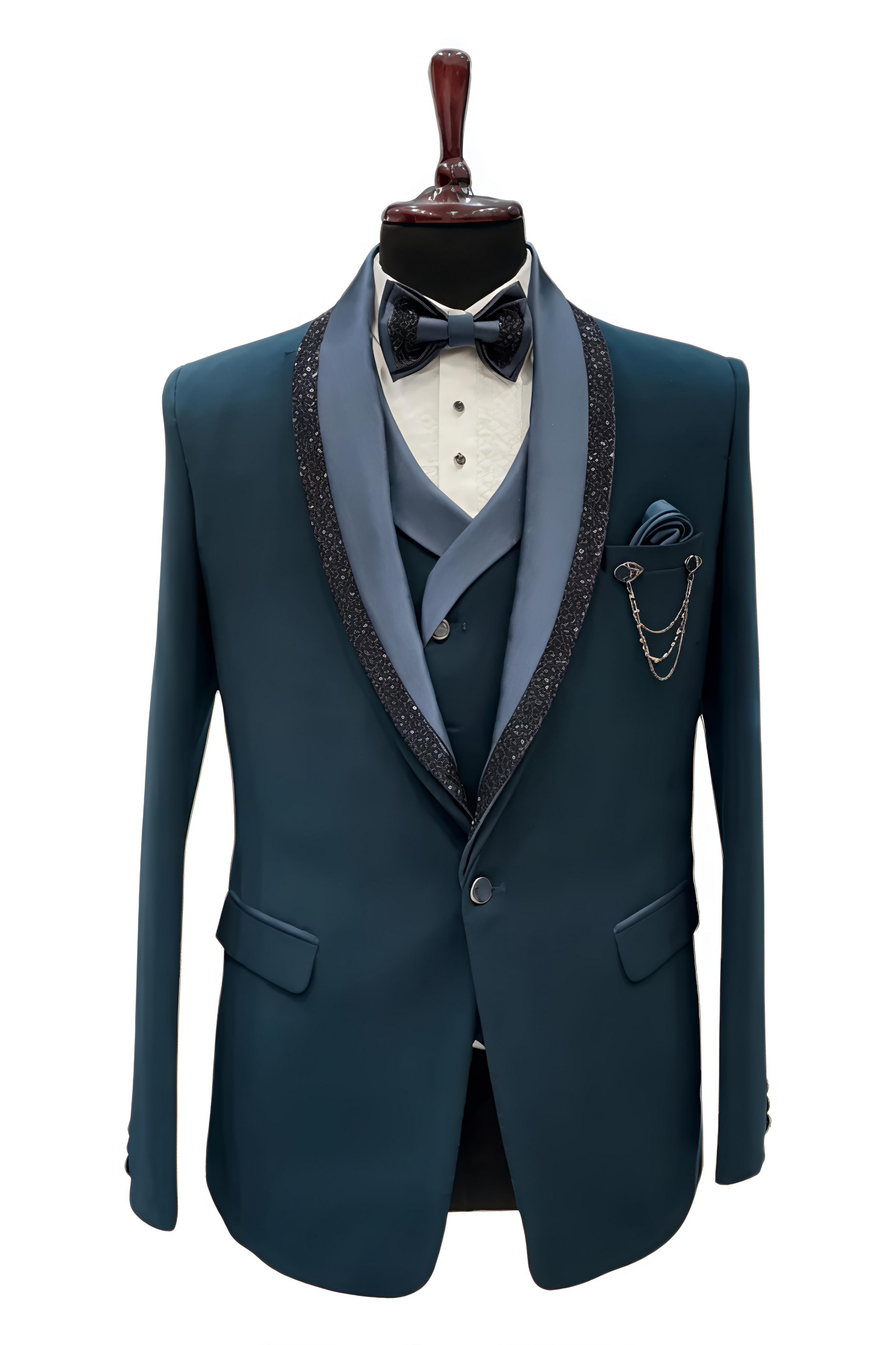 This Deep Blue tuxedo features elegant curtdana embroidery, adding a touch of sophistication to your look. The 5-piece set includes a jacket, pants, vest, dress shirt, and bow tie. Stand out from the crowd and make a statement with this expertly crafted and stylish tuxedo.