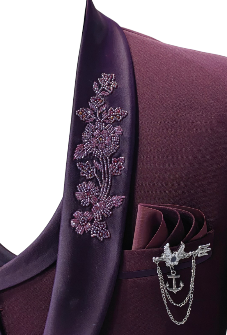 Make a statement in our maroon 5-Piece Tuxedo adorned with exquisite curtdana embroidery. Elevating traditional elegance, this ensemble combines modern sophistication with intricate detailing. Perfect for those seeking a bold and unique look for weddings, proms, or any formal event.