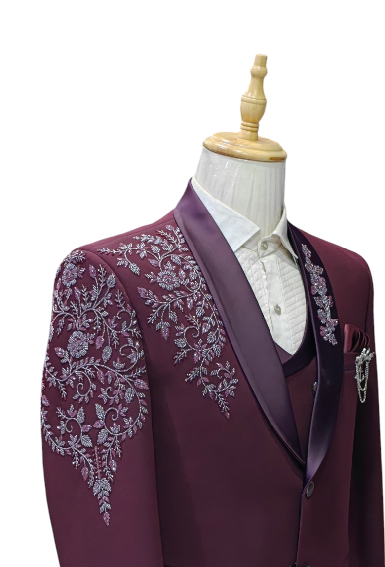 Maroon 5- piece tuxedo with curtdana embroidery.