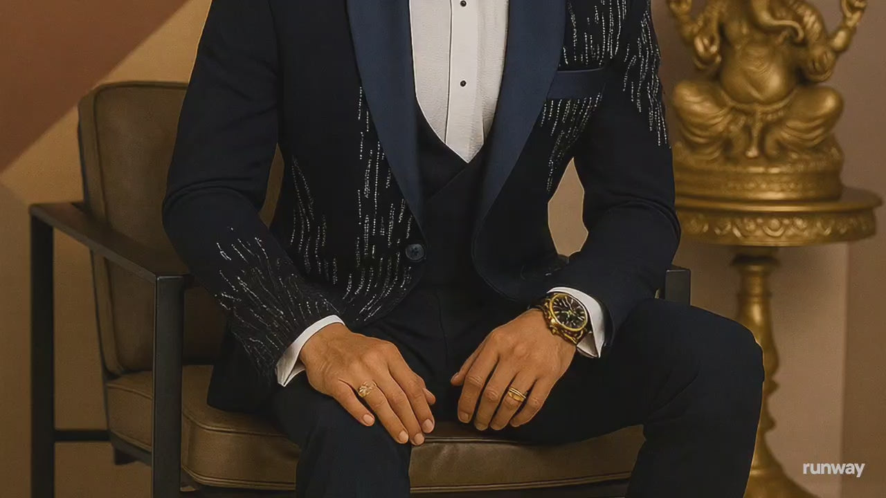 Elevate your formal attire with our Rituhar tuxedo. This 5-piece set features intricate curtdana embroidery, adding a touch of sophistication to the classic black design. Expertly crafted for a sleek and polished look. Perfect for any special occasion.