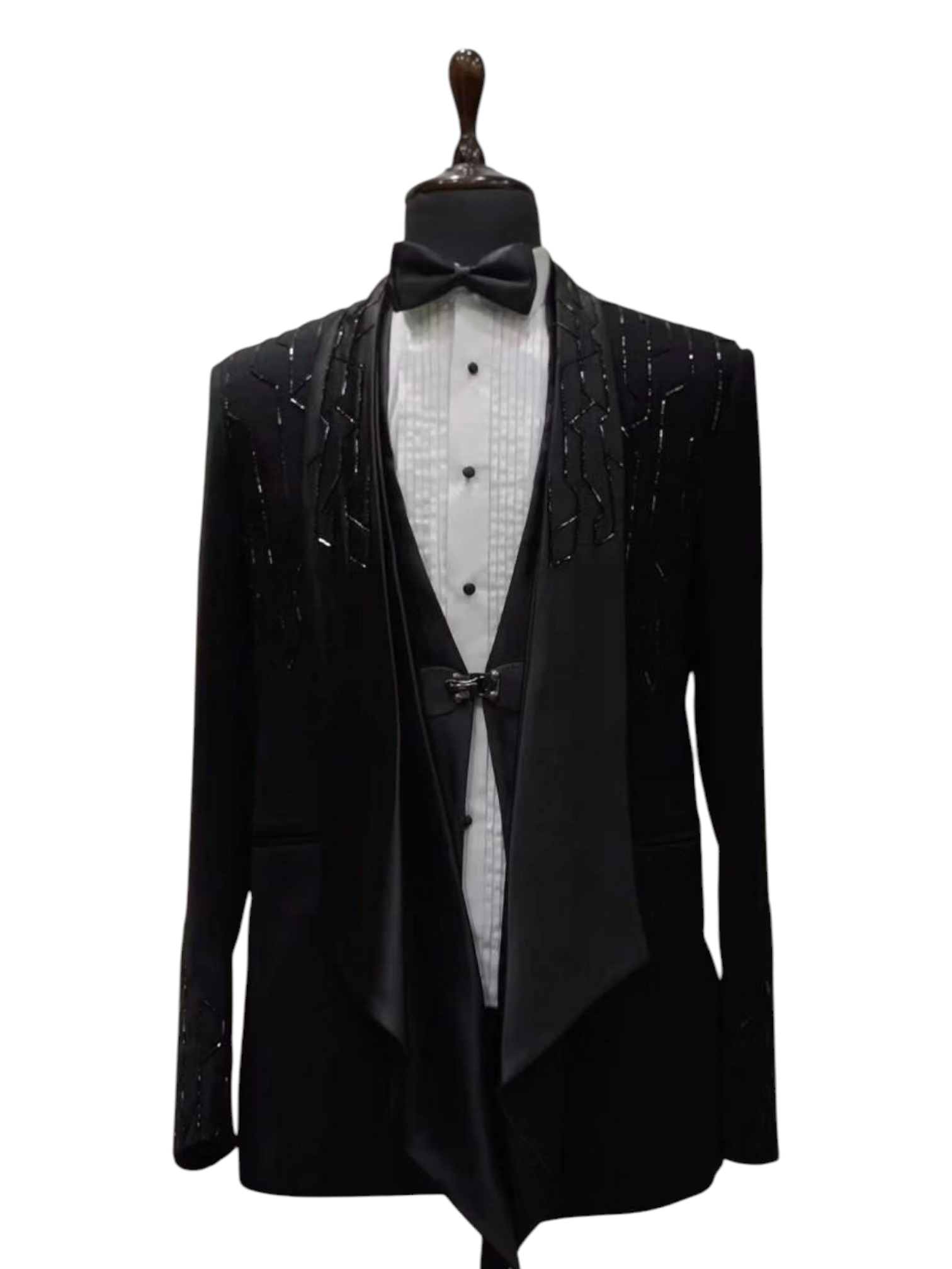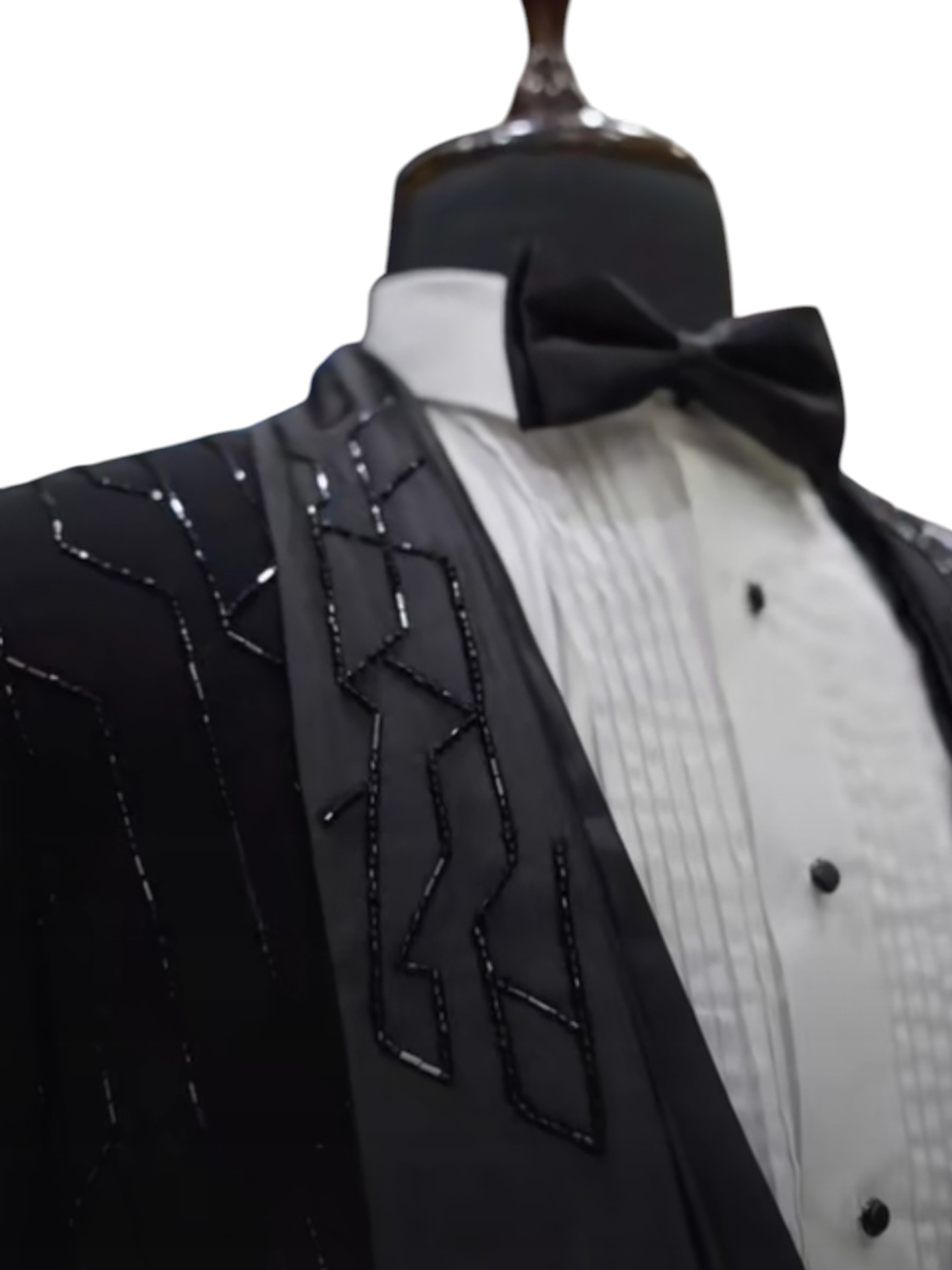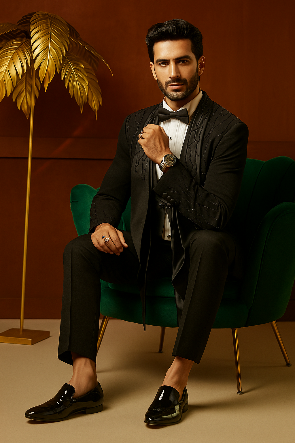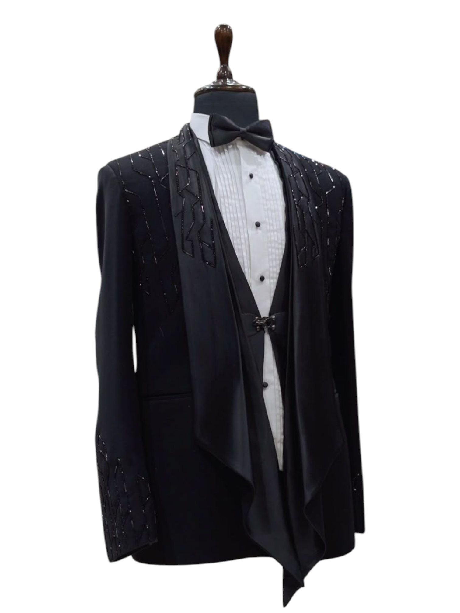 Elevate your formal attire with our Black 5-piece tuxedo. Impress with the intricate curtdana embroidery, for a touch of elegance and sophistication. Crafted with precision, this tuxedo features a timeless black color that never goes out of style. Perfect for any special occasion.